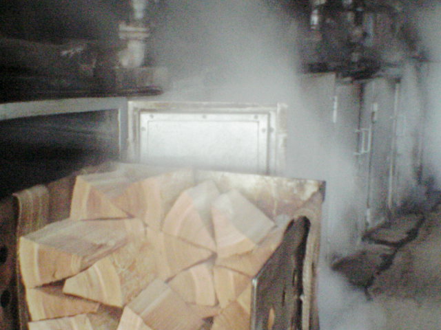 | 煮沸 滅菌するため車ごと蒸釜にいれ、煮沸して木をやわらかくします。 |